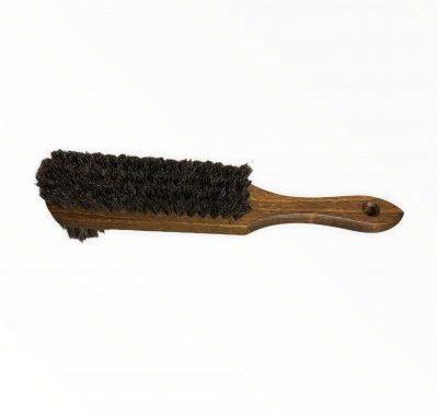 Skoborste med påstrykare samt trähandtag. Riktigt tät borst av högkvalitativ hästtagel. 25 cm lång inkl. trähandtag. Smidig hästhårsborste om du ska använda bara till en färg. Man ska alltid ha en borste till varje färg, annars kan skorna bli missfärgade.
